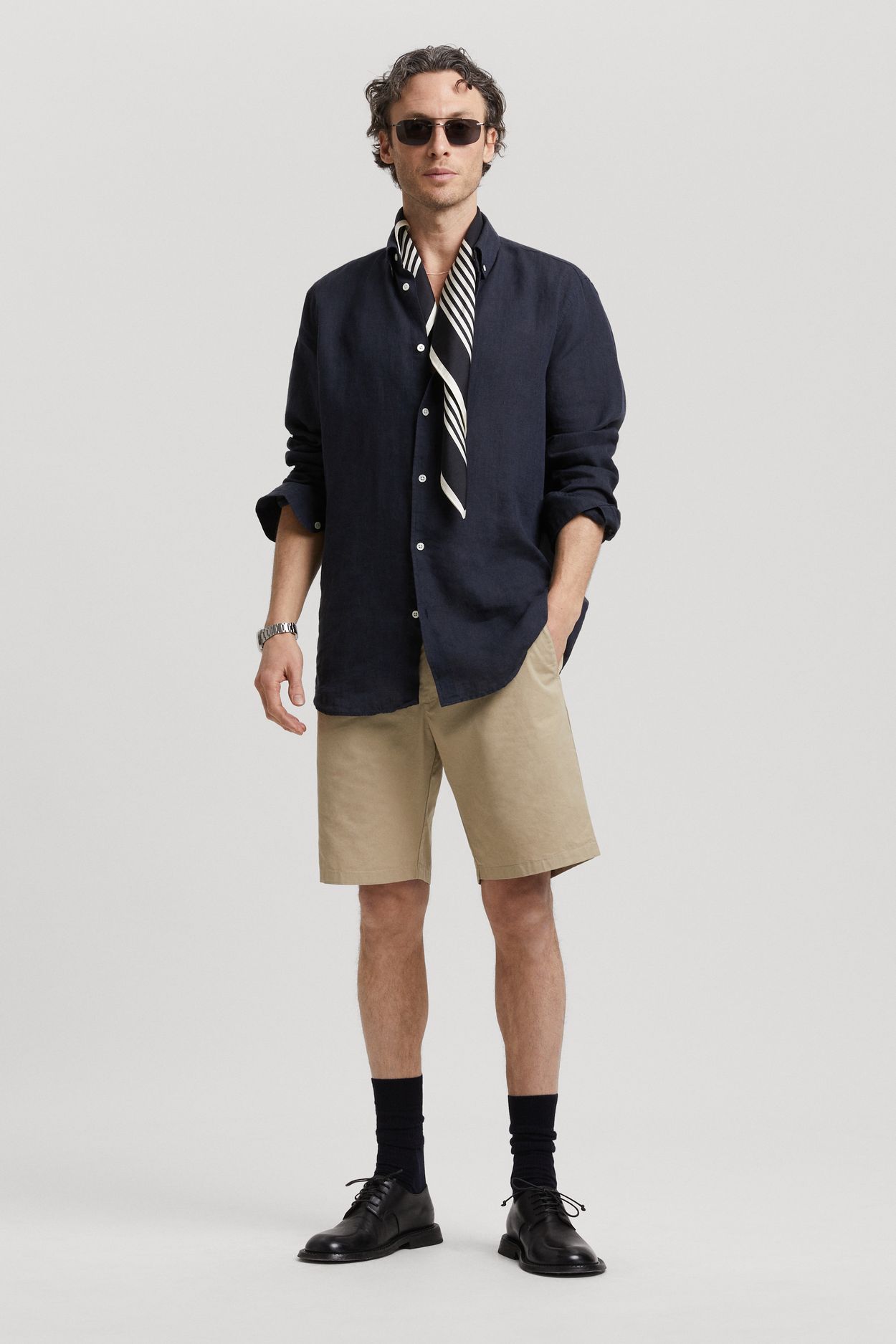 Viktor wears The Linen Shirt in Dark Navy, The Shorts in Beige and The Ribbed Cotton Socks in Black.