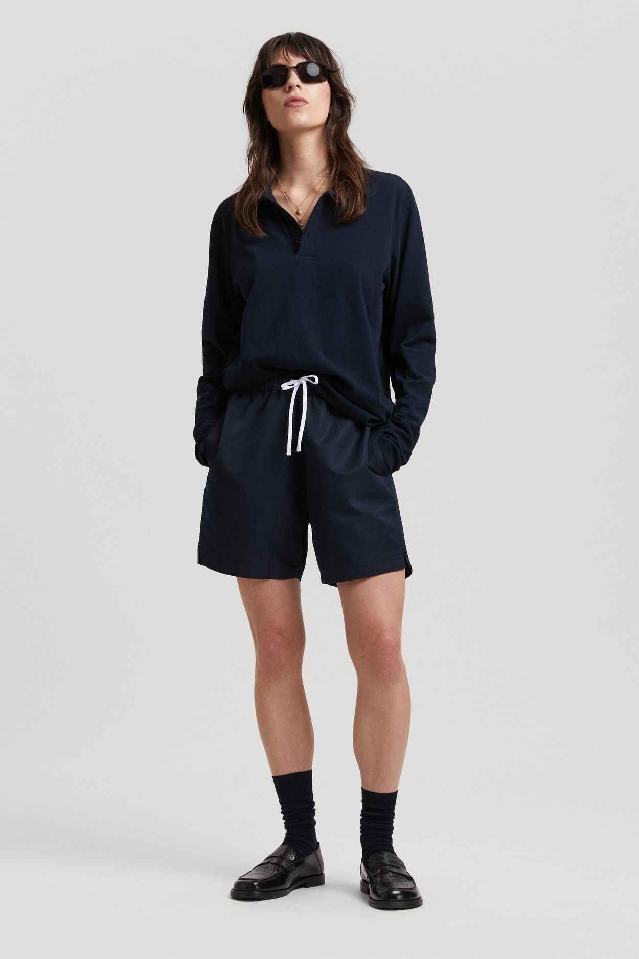 Diana wears The Long Sleeve Pique Polo (Men's) and The Swim Shorts (Men's), both in Dark Navy.