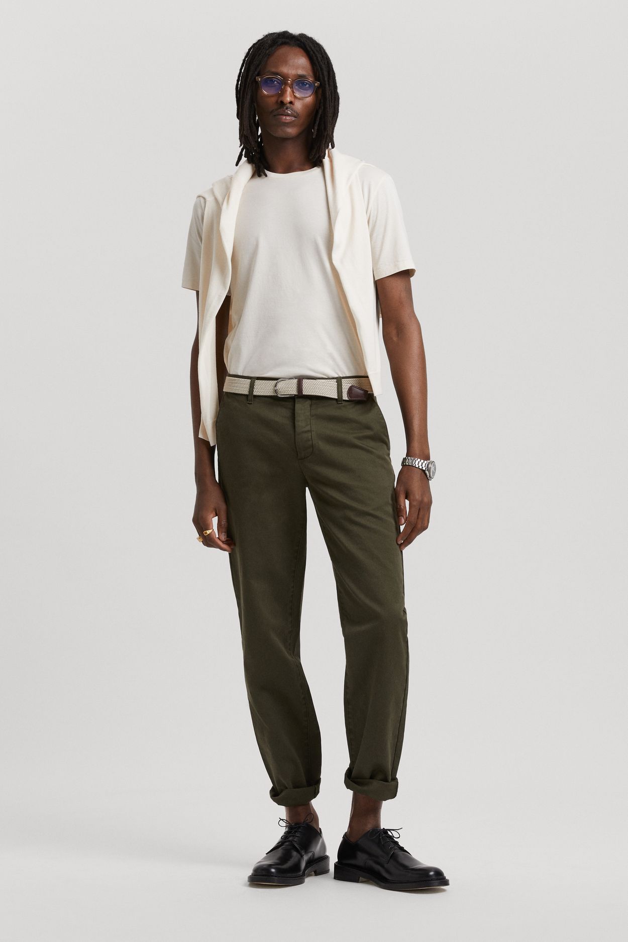 Abokey wears The Lightweight T-shirt in Off White, The Cotton Sweater in Off White, The Chinos in Khaki Green and The Braided Elastic Belt in Beige.