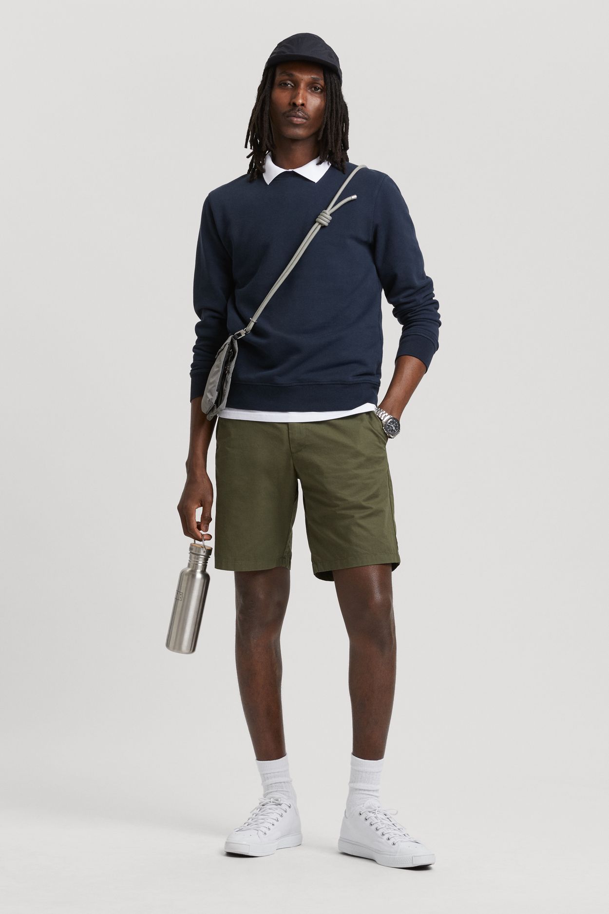 Abokey wears The Pique Polo in White, The Sweatshirt in Dark Navy and The Shorts in Olive.