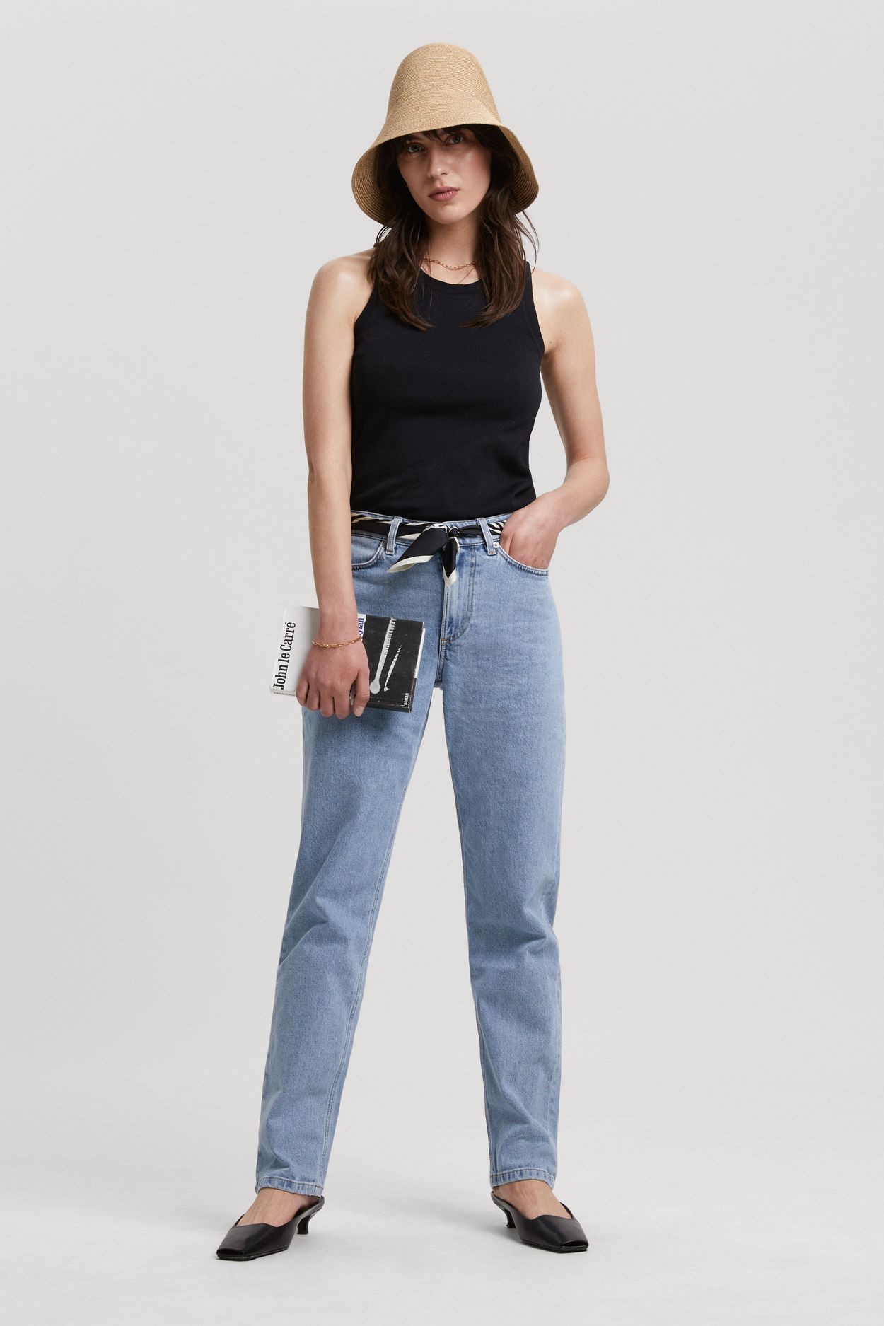 Diana wears The Tank Top in Black and The Standard Jeans in Stone Bleach.