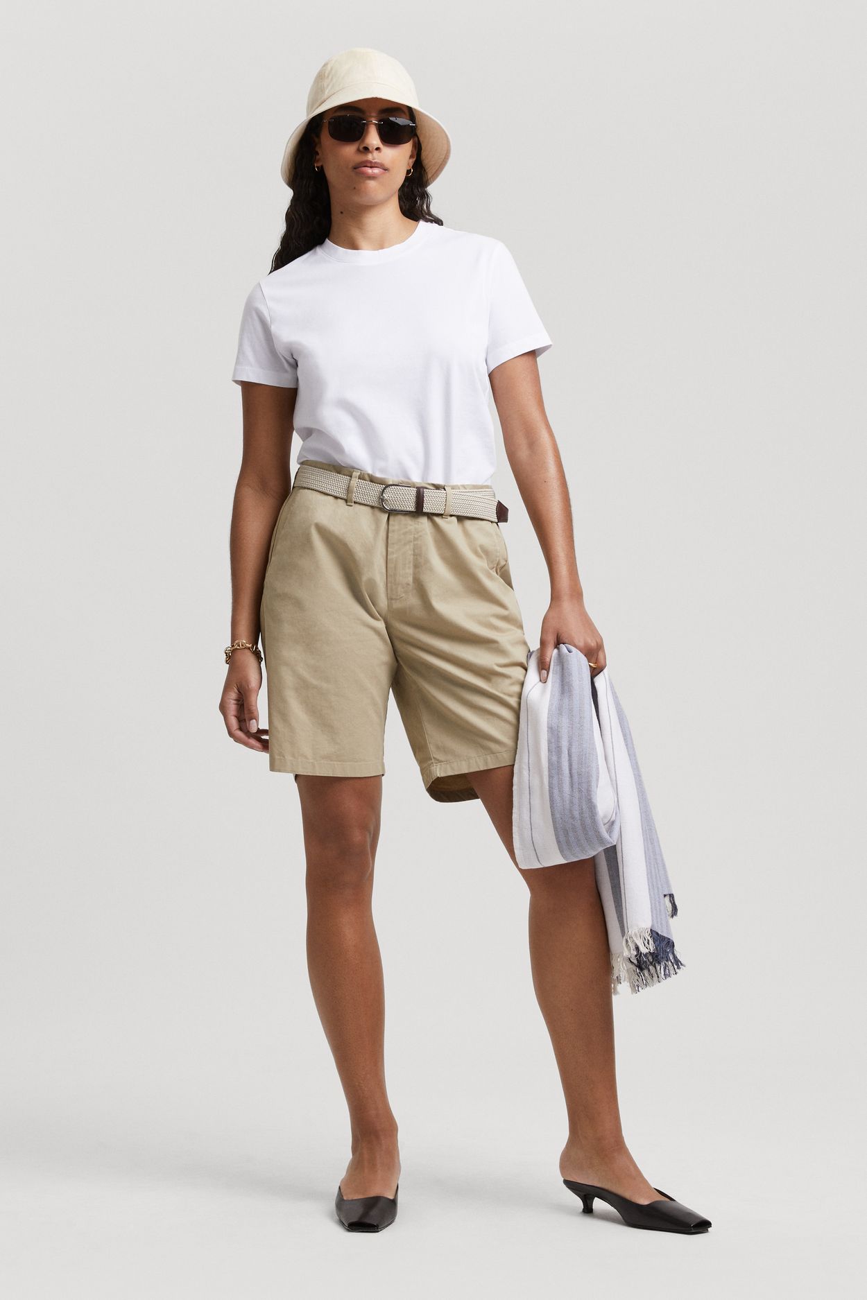 Luna wears The T-shirt in White, The Shorts (Men's) in Beige and The Braided Elastic Belt in Beige.